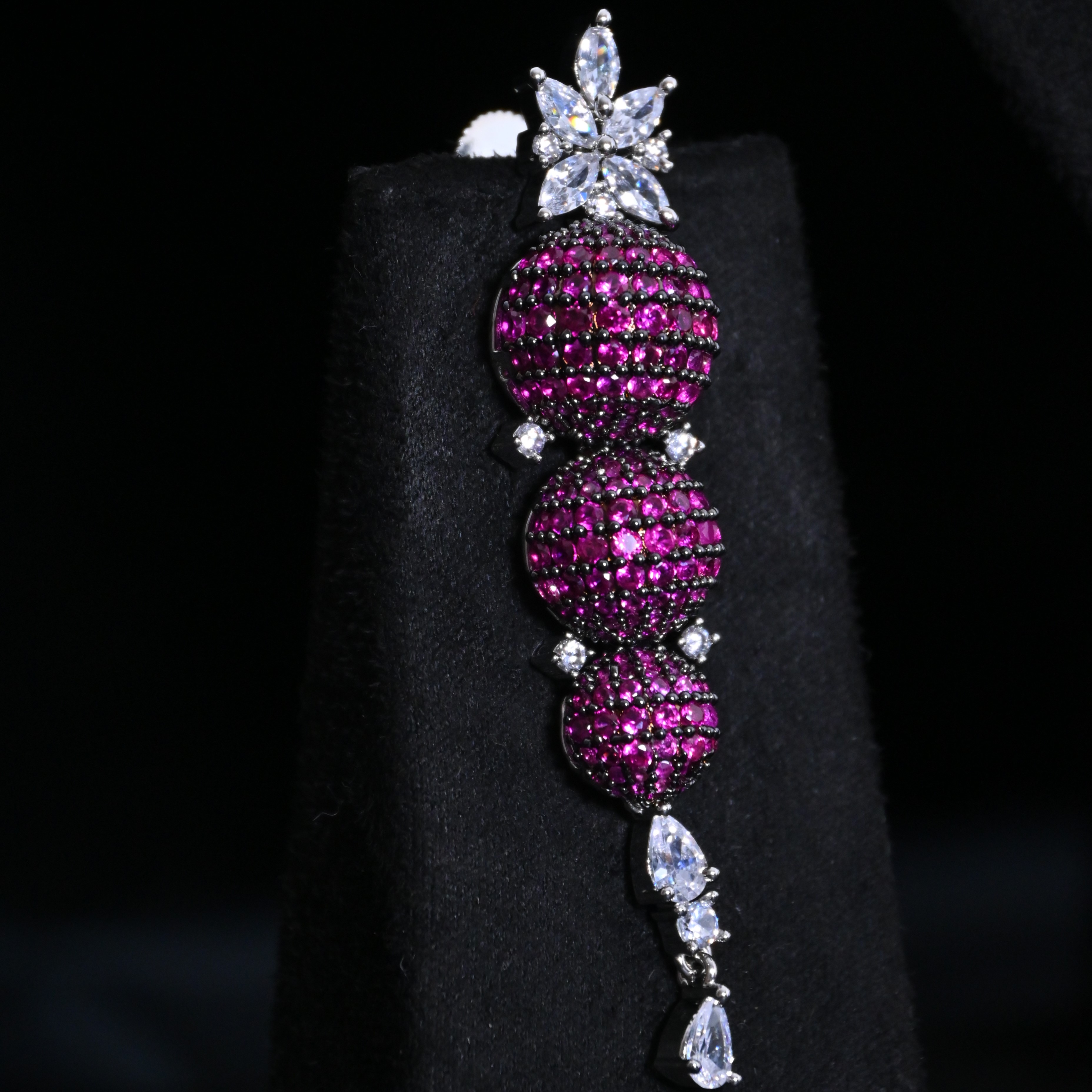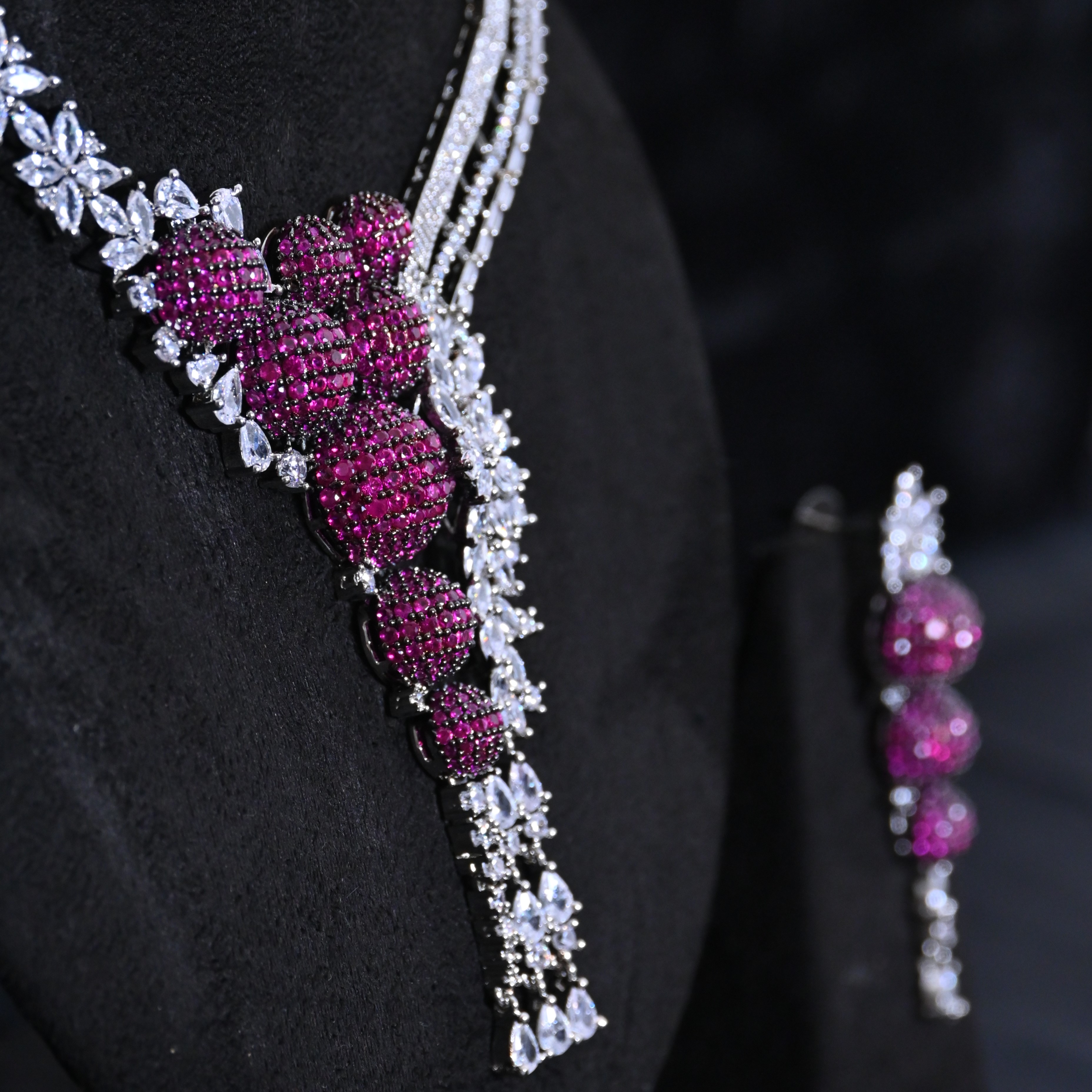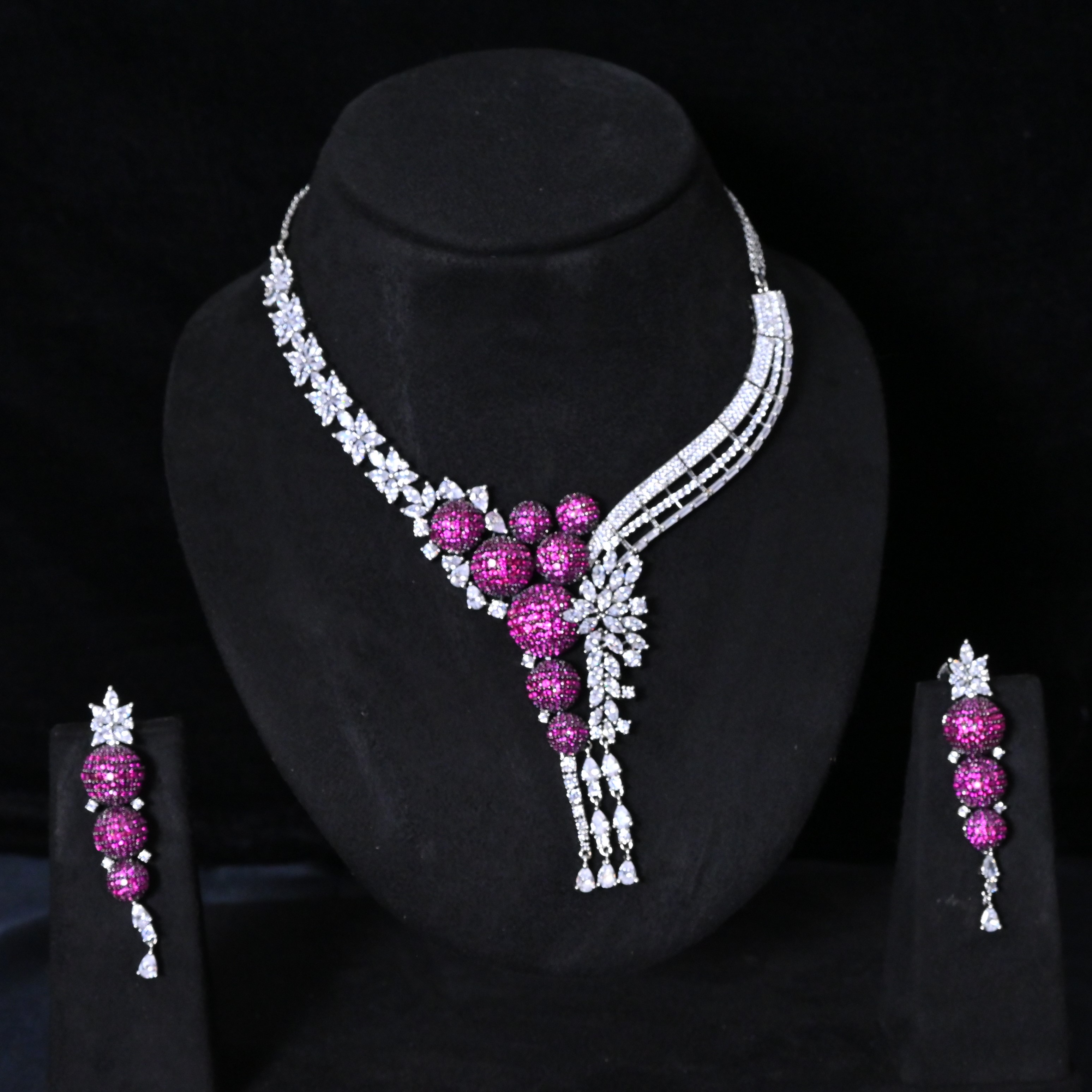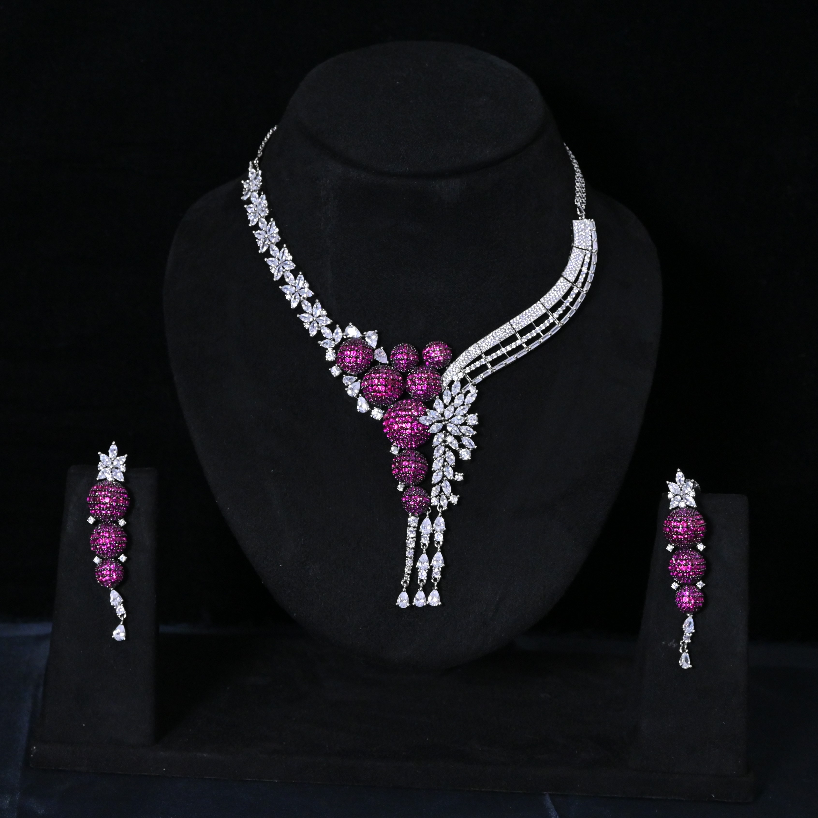 Elevate your special occasions with this exquisite necklace and earring set, masterfully crafted with stunning purple crystal spheres and brilliant diamonds. The necklace features a sophisticated asymmetrical design where meticulously arranged spheres in rich purple hues are complemented by delicate floral patterns created with clear stones. The sterling silver framework showcases three elegant strands that cascade with dimensional crystal spheres, ending in refined droplets that add movement and sparkle.