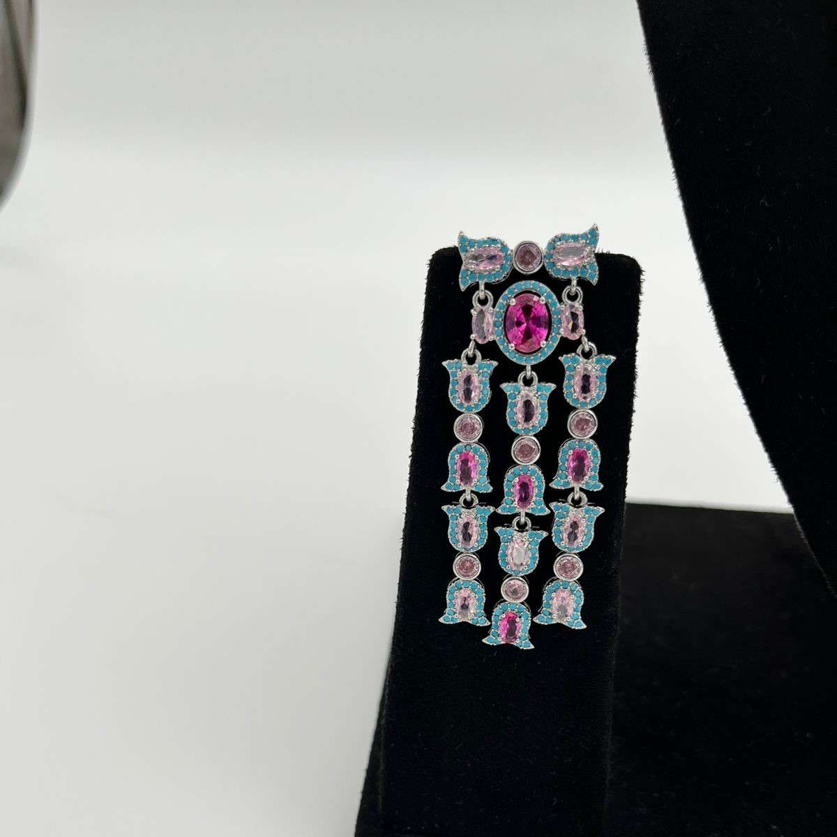Make a stunning statement with this exquisite three-layered necklace and earring set. The necklace features an elegant cascade of alternating deep red oval stones and brilliant crystal-like embellishments, creating a luxurious triple-strand design that gracefully adorns the neckline. The matching drop earrings complement the necklace perfectly, showcasing the same sophisticated combination of red stones and sparkling elements. This glamorous set strikes the perfect balance between classic sophistication and contemporary style, making it an ideal choice for special occasions, weddings, or formal events.