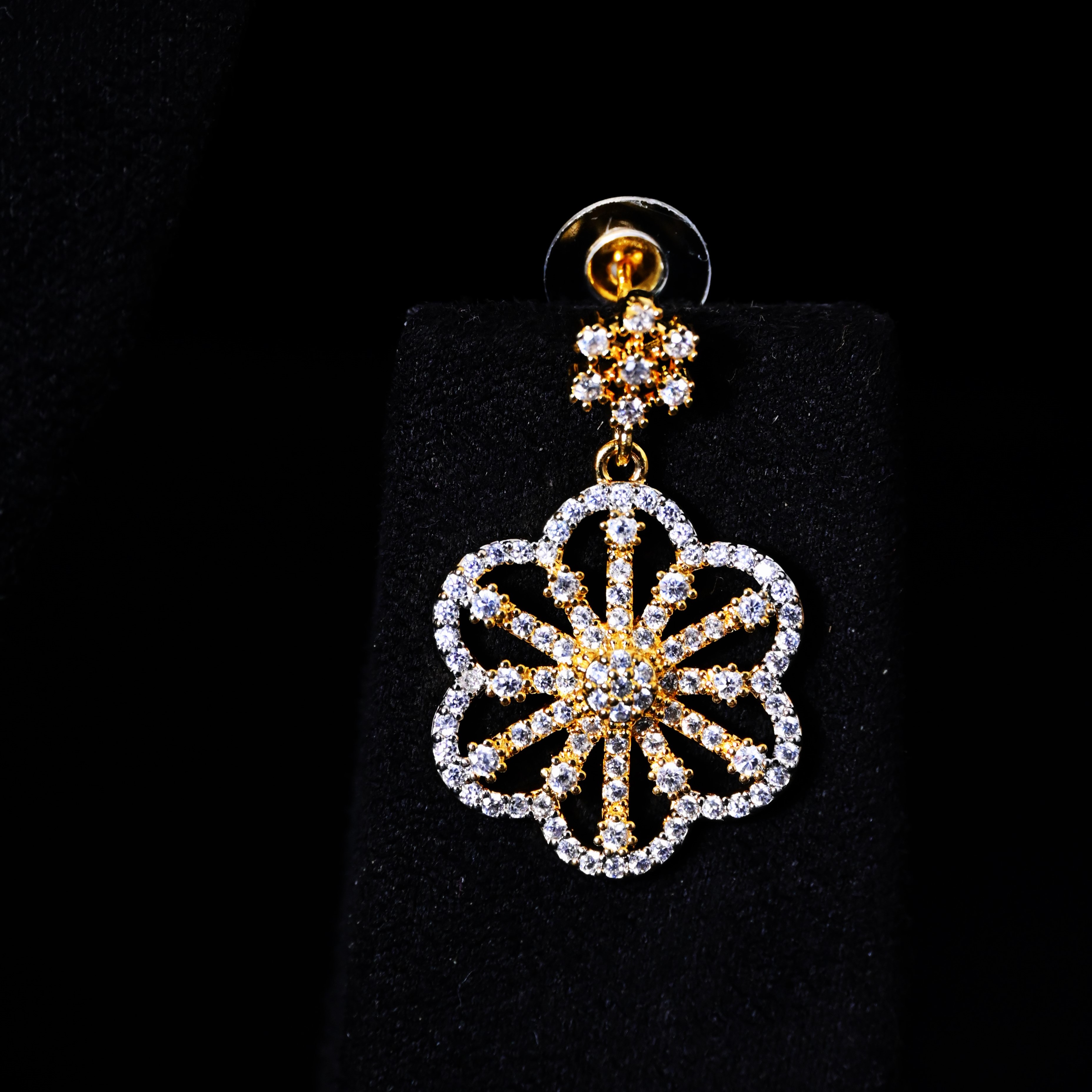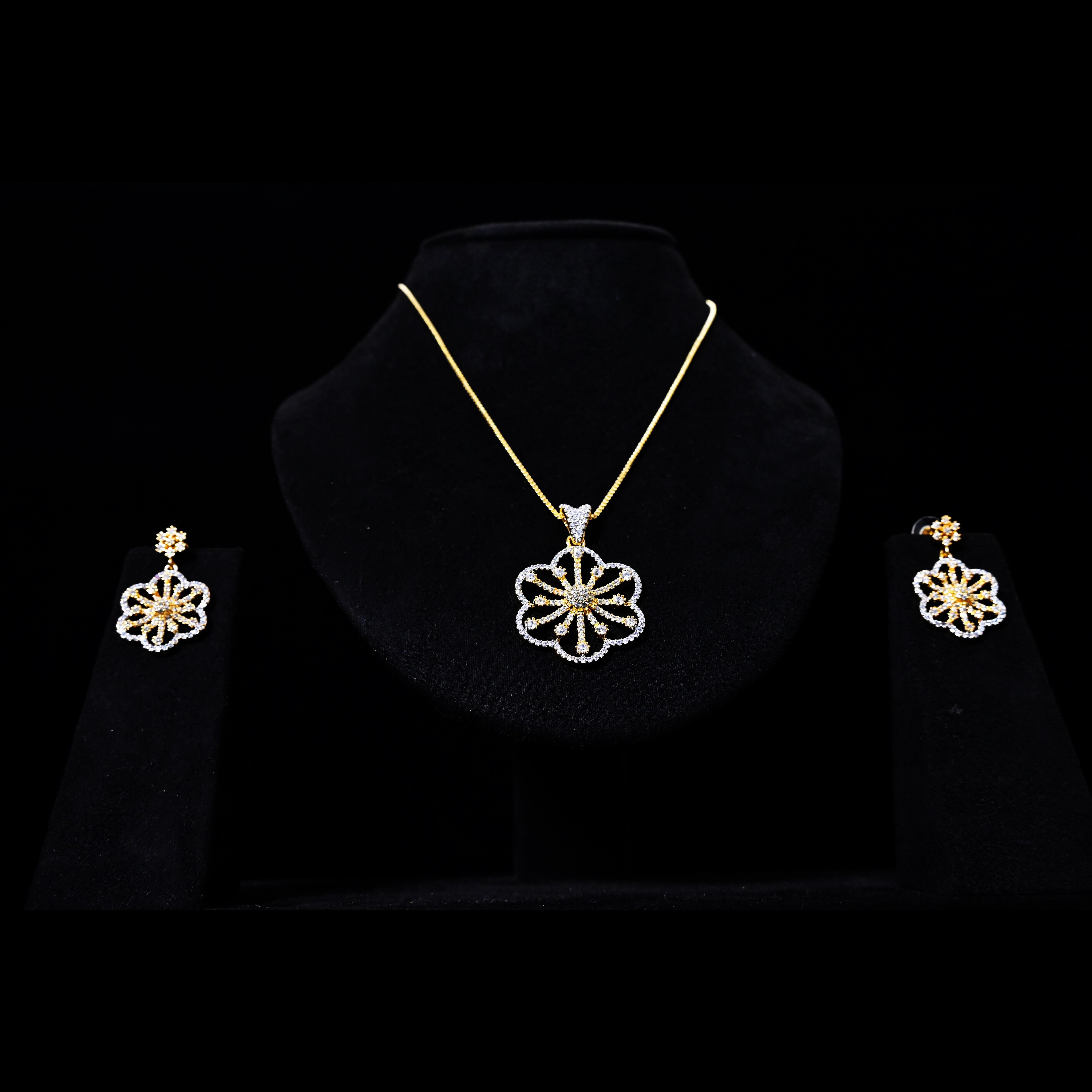 An exquisite creation designed for the modern woman who loves timeless glamour. This designer pendant set features a striking centerpiece with cascading chain tassels, paired with dazzling ear drops