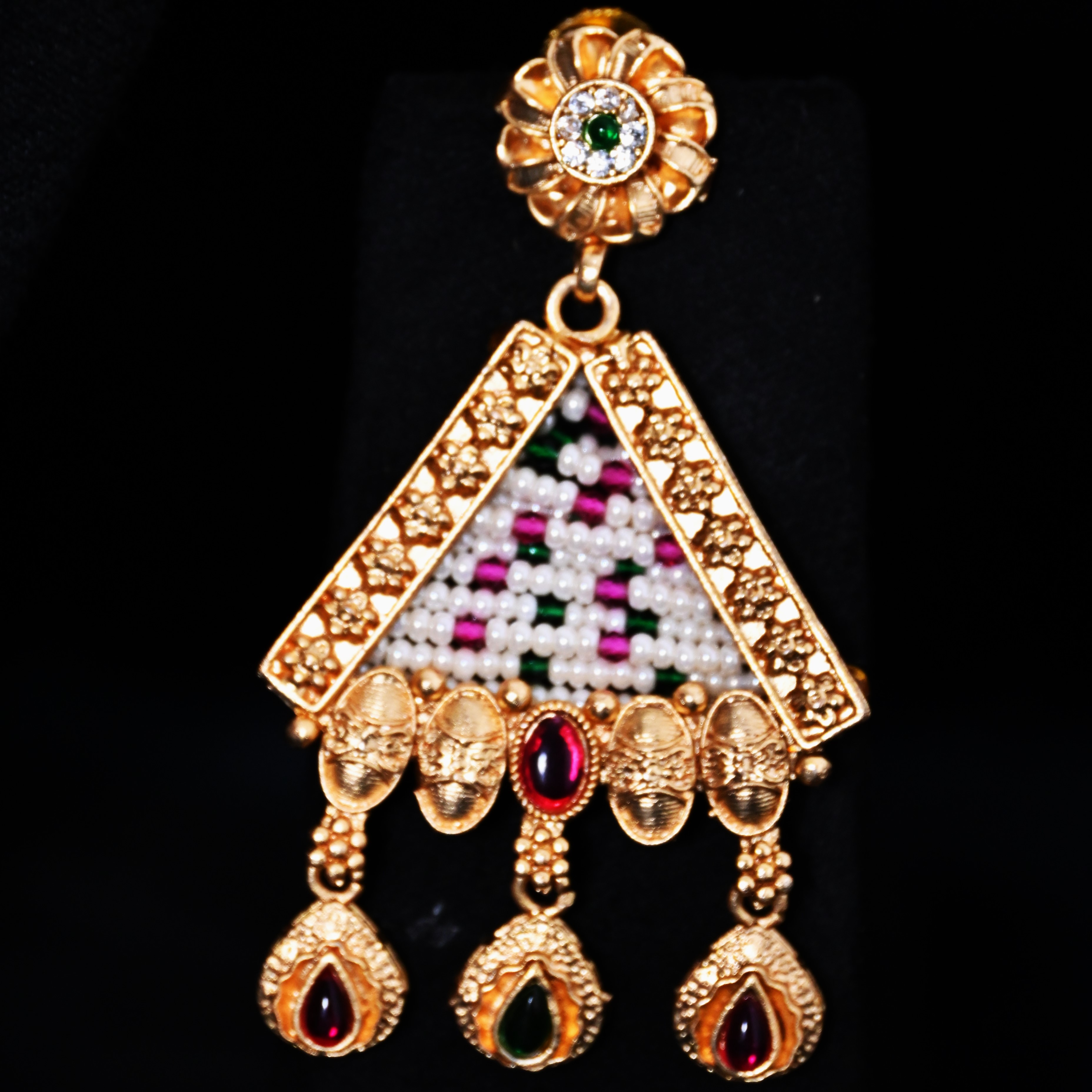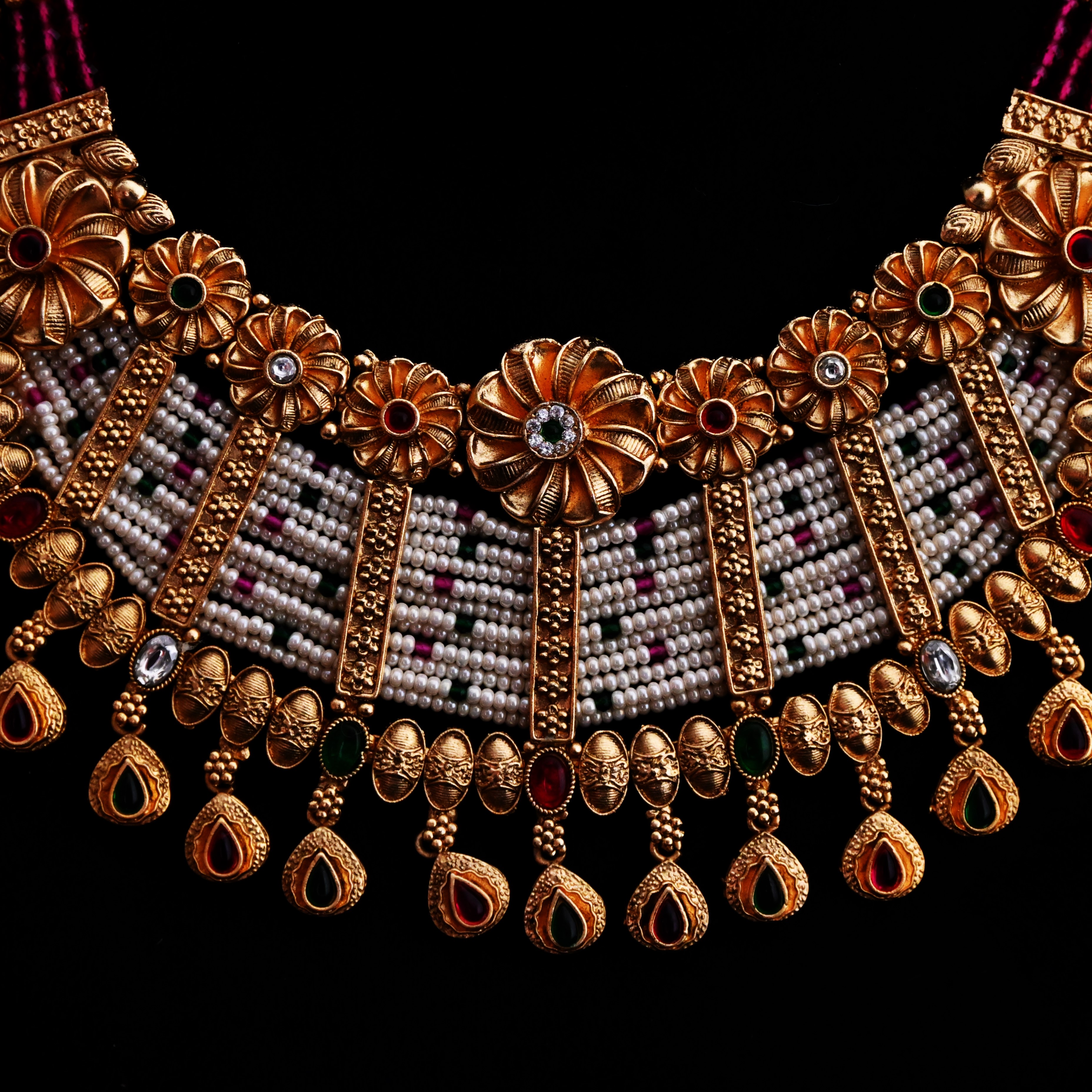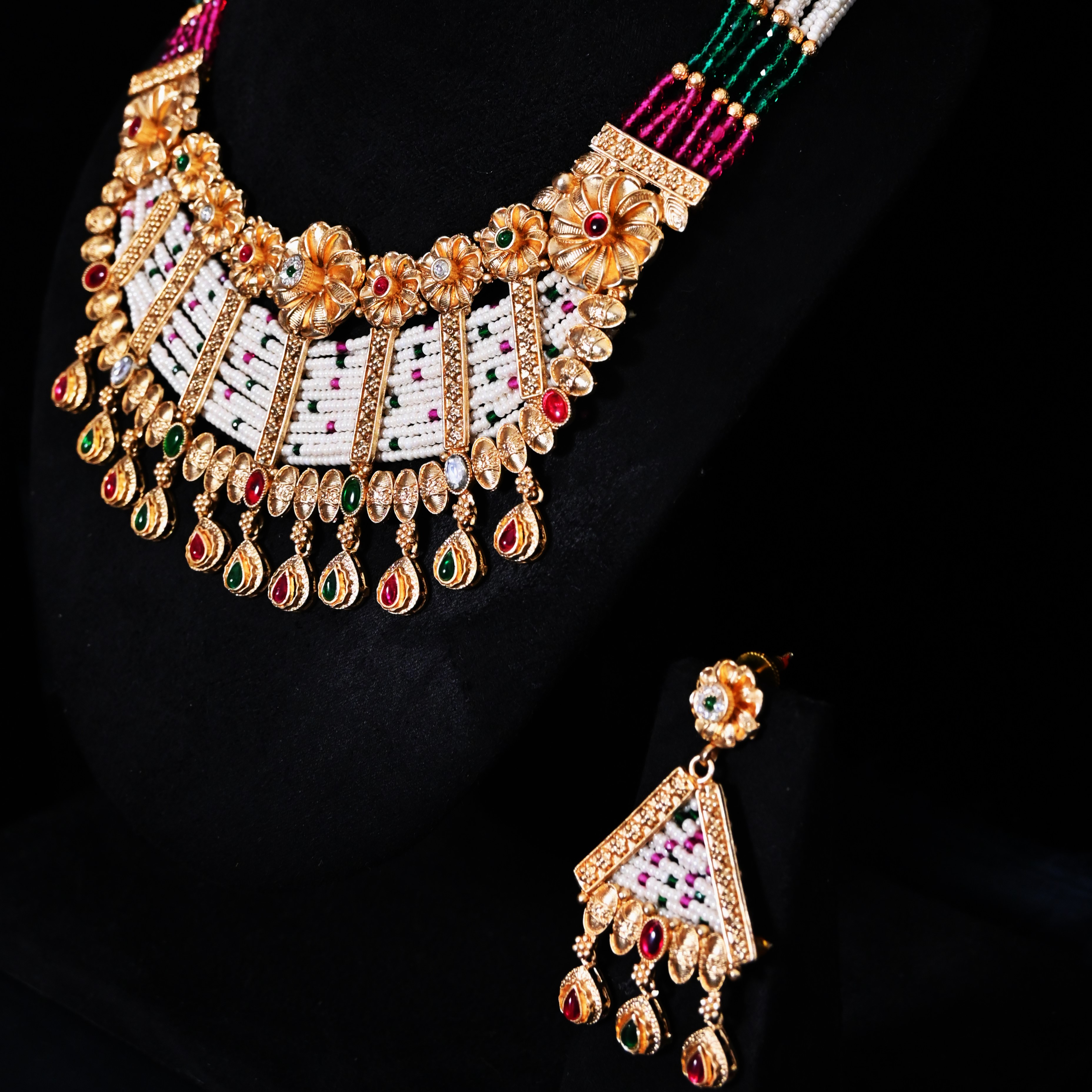Featuring a statement traditional necklace encrusted with uncut polki stones and a vibrant emerald centerpiece, this set is adorned with intricate detailing and complemented by cascading pearl and green bead drops.